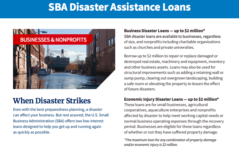 These low-interest loans may be used to pay fixed debts, payroll, accounts payable and other bills that can’t be paid because of the disaster’s impact.